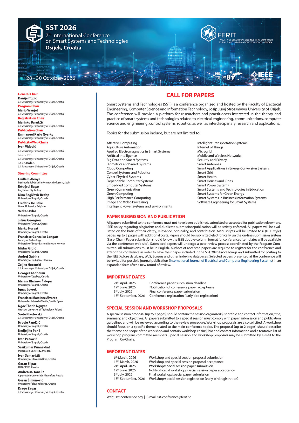 International Conference on Smart Systems and Technologies (SST) is a conference organized and hosted by the Faculty of Electrical Engineering, Computer Science and Information Technology Osijek, Josip Juraj Strossmayer University of Osijek. The conference will provide a platform for researchers and practitioners interested in the theory and practice of smart systems and technologies related to electrical engineering, communications, computer science and engineering, control systems, robotics, as well as interdisciplinary research and applications.
